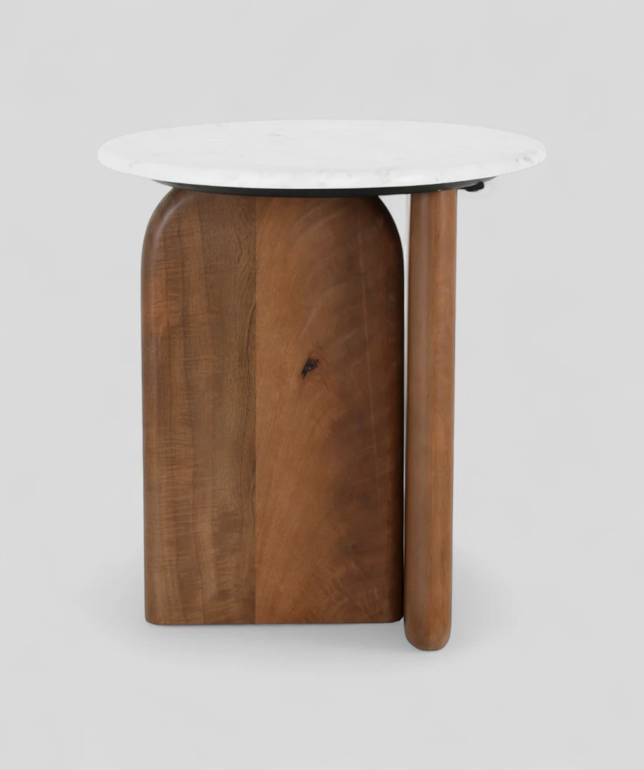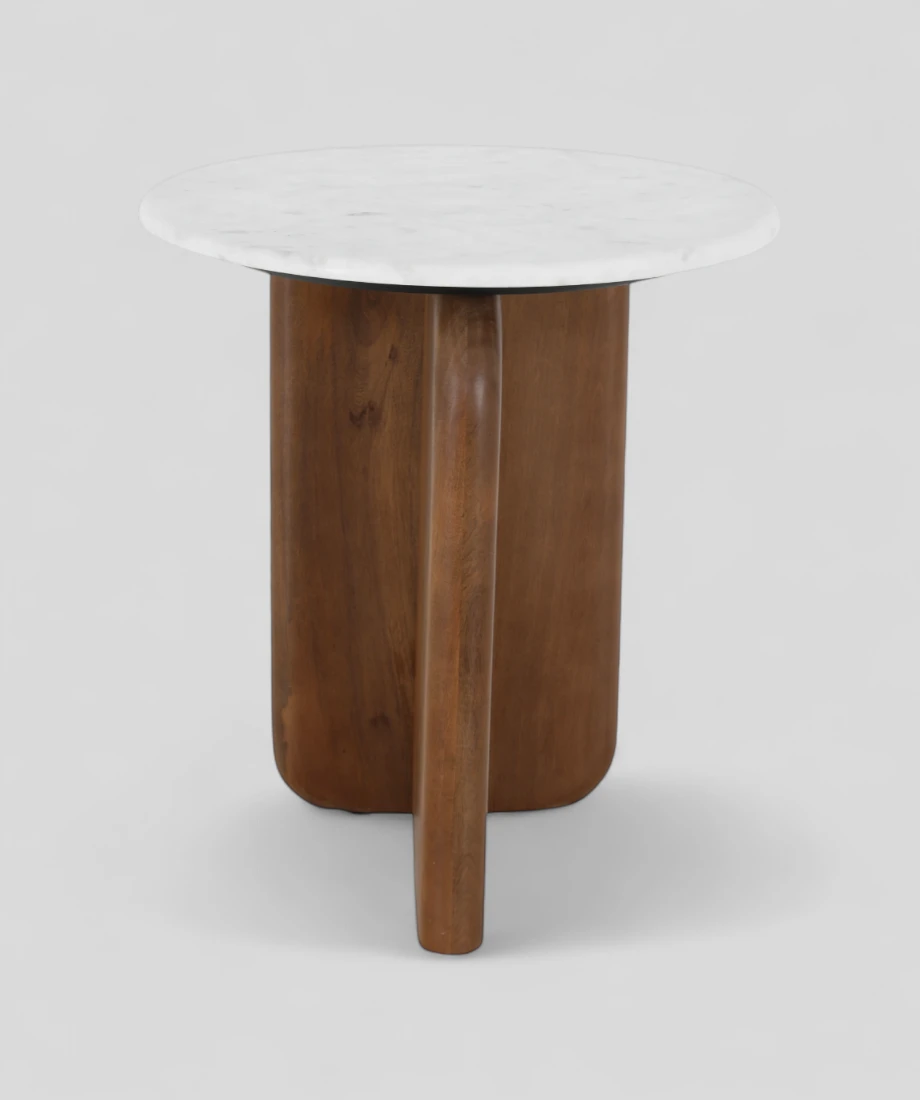 This stylish side table showcases a sleek round top crafted from White Banswara marble, resting on a sculptural mango wood base in a rich brown finish. The soft curves and clean lines create a harmonious blend of natural texture and contemporary elegance, making it a perfect accent piece for modern and transitional interiors.