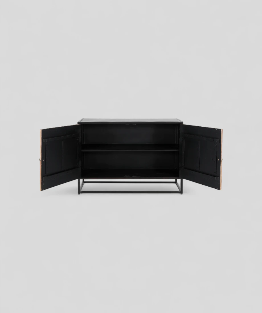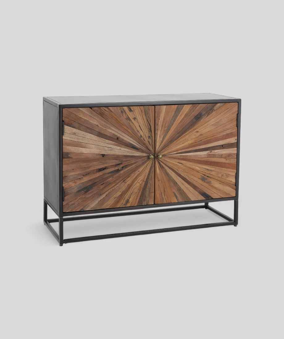 The cabinet’s doors are a masterpiece of design ? composed of carefully selected wooden slats arranged in a dynamic sunray pattern that radiates outward from the center, drawing the eye with its striking visual rhythm. Each wooden piece varies in tone, grain, and texture, reflecting the authentic character of reclaimed wood and lending a warm, tactile richness to the overall aesthetic. The natural imperfections and weathered marks tell a story of time and craftsmanship, making every cabinet unique.