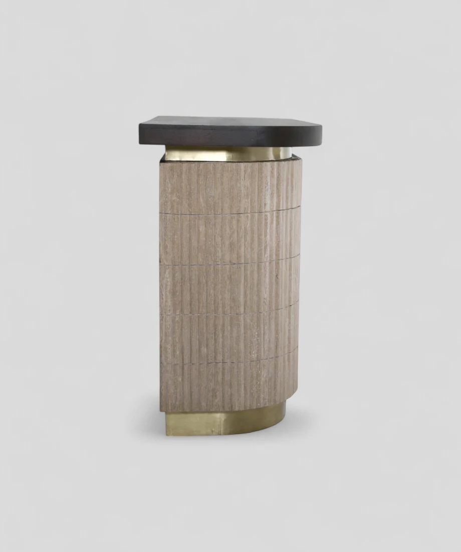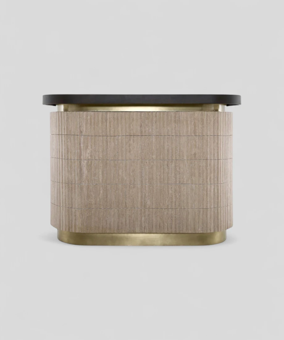 Elegant and refined, this bar counter features a stunning outer body clad in beige Travertine marble, paired with a rich mango wood top. The inner structure is also crafted from mango wood, offering durability and warmth. Accentuated with iron skating in a luxurious brass finish cladding, this piece combines natural beauty with contemporary sophistication—ideal for upscale entertaining spaces.